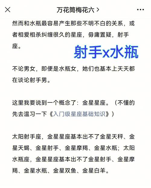 注意事项:瓶子遇上射手完全可以自由发挥,因为他懒得理您。若是您本著爱是牺牲奉献而用力配合他,弄得自己愁眉苦脸,射手会觉得您活该(但他也认为那是您的自由);他要忙、要享受的太多了,从没想过勉强别人迁就自己。两人相处时不会无聊无趣,但是对您们这种外务多、重自由的人来说,对於每天例行的那些生活琐事最好能够先取得共识;否则,经济问题恐怕会让您们感到不自由的!